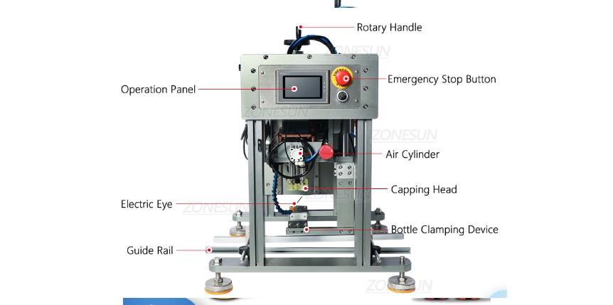 Masina este conceputa pentru inchiderea sticlelor polimerice sau din sticla cu capace cu filet. Masina poate fi ajustata pentru lucru cu calpace de difrite modele.